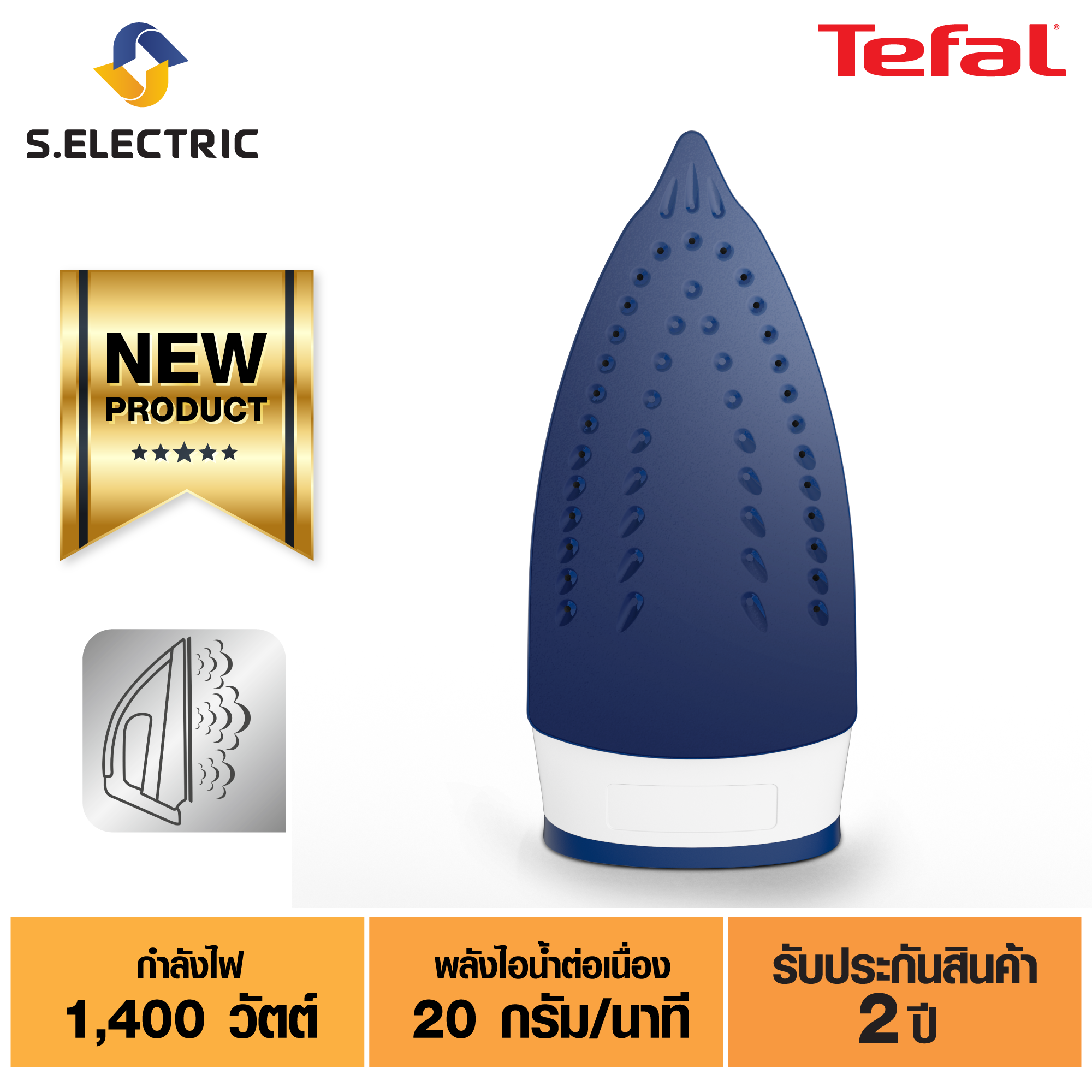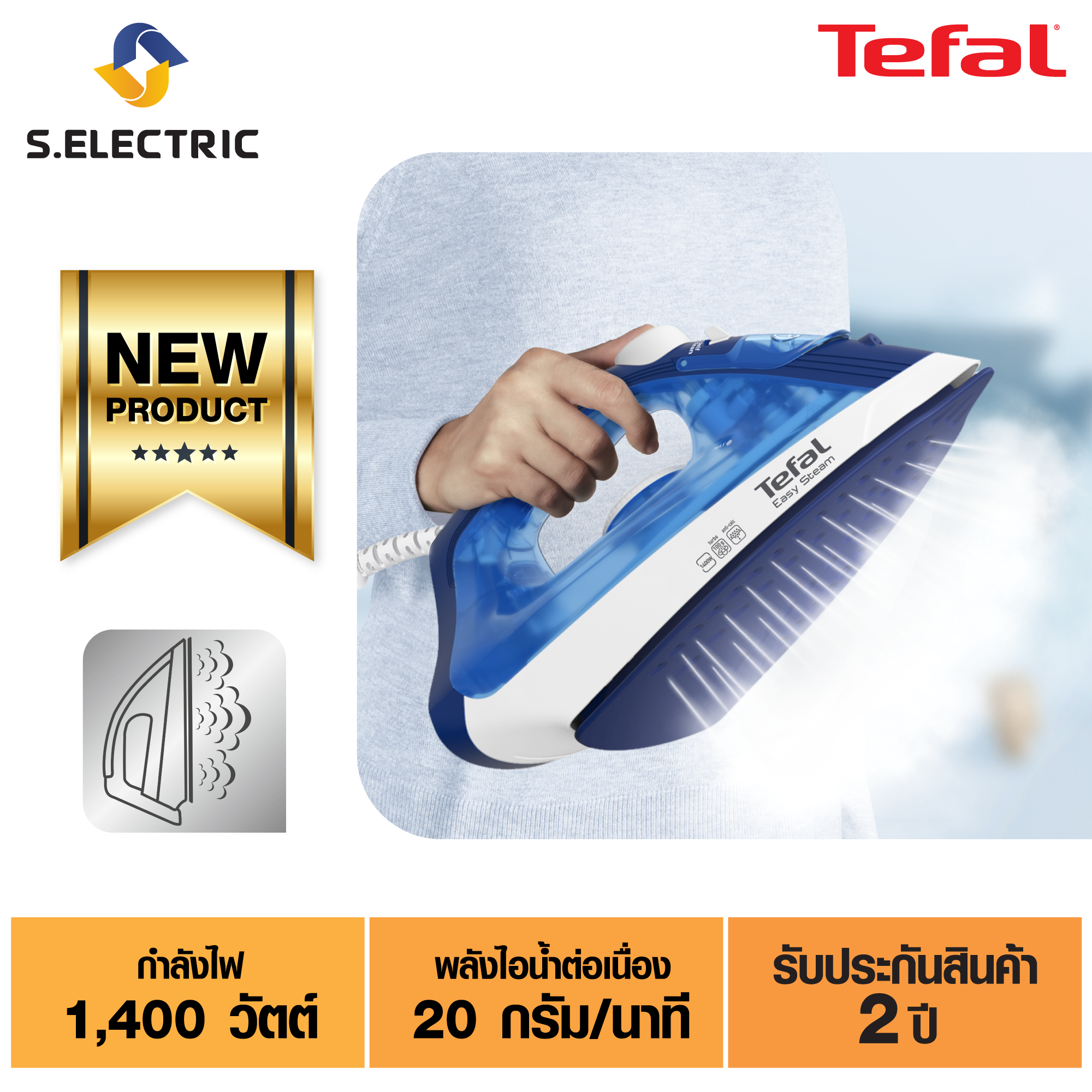 Tefal เตารีดไอน้ำ EASY STEAM รุ่น FV1941T0 กำลังไฟ 1400 วัตต์ ความจุแท้งค์น้ำ 220 มล. หน้าเตารีด colored PTFE ประกัน 2 ปี ส่งฟรี