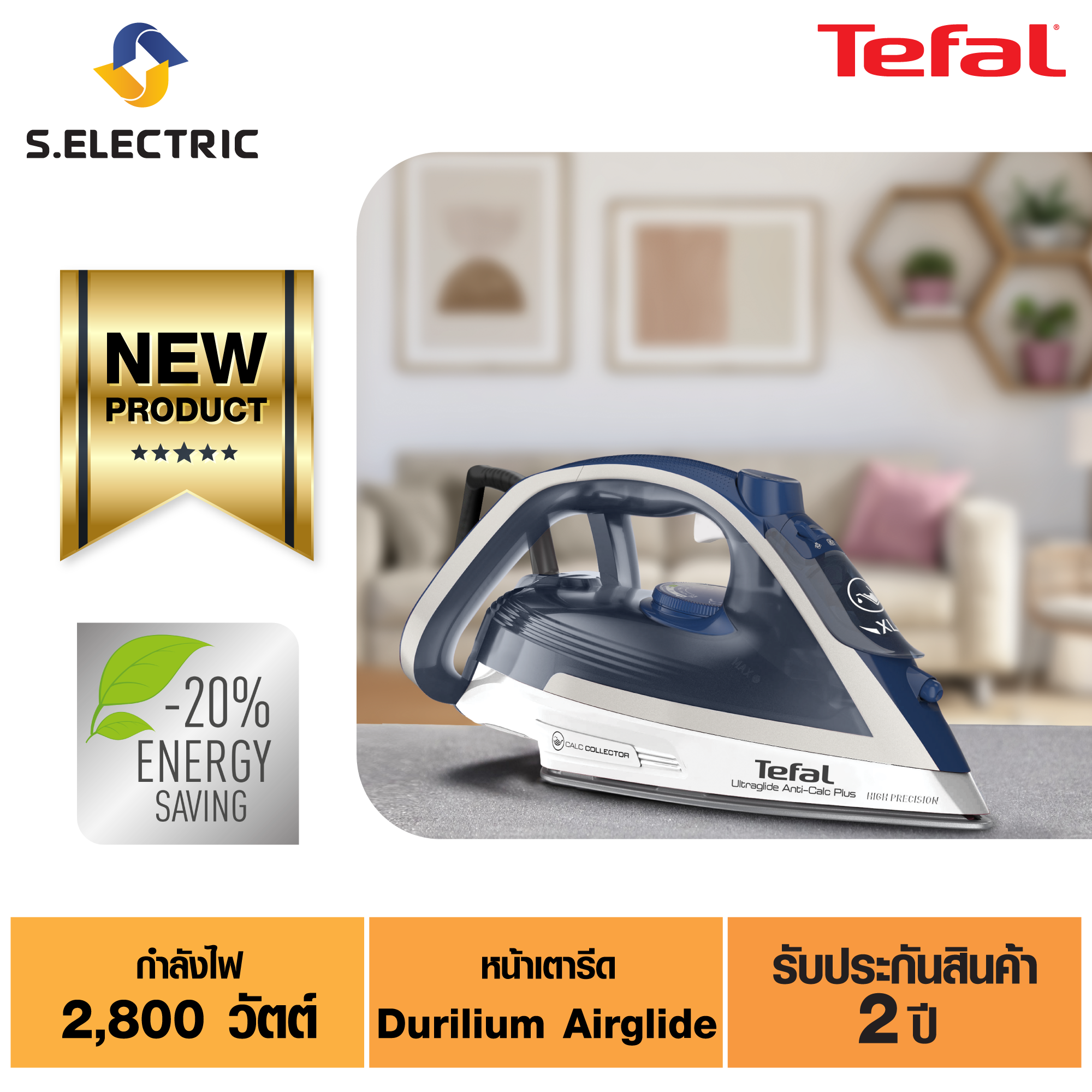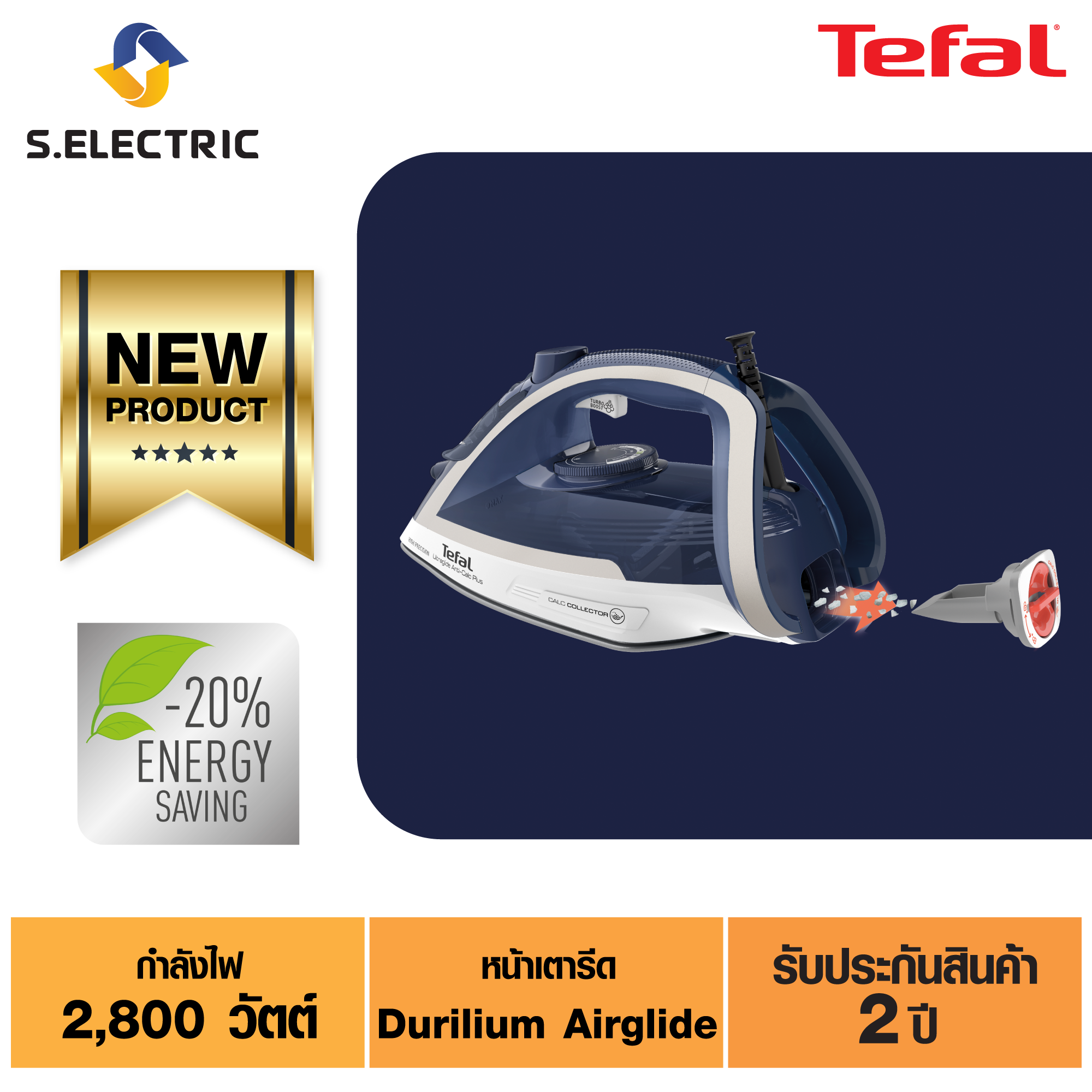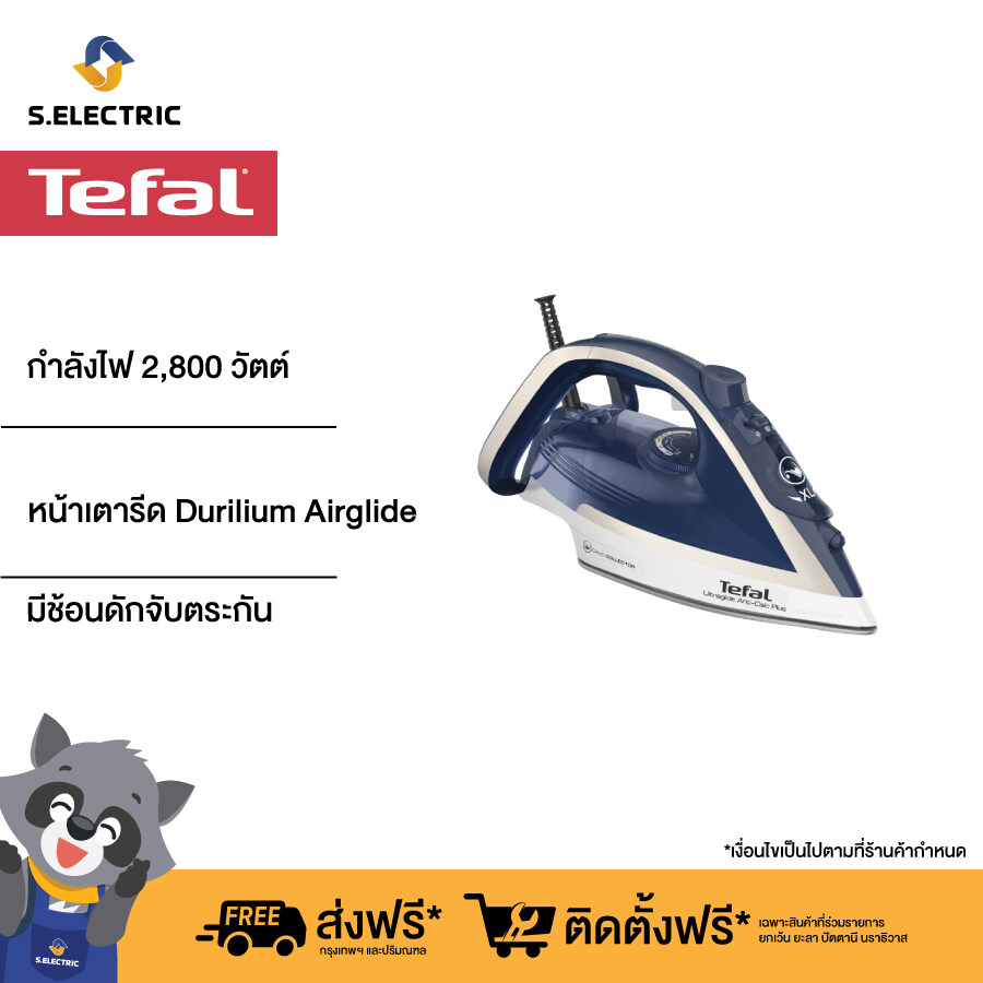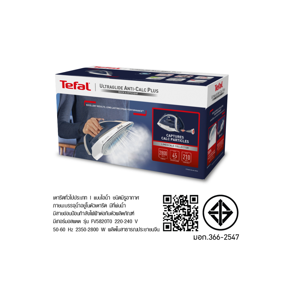 Tefal เตารีดไอน้ำ ULTRAGLIDE ANTI CALC PLUS รุ่น FV5820T0 กำลังไฟ 2,800 วัตต์ หน้าเตารีด Durilium Airglide ใช้งานง่ายเหมาะกับเสื้อผ้าทุกชนิด มีช้อนดักจับตระกัน